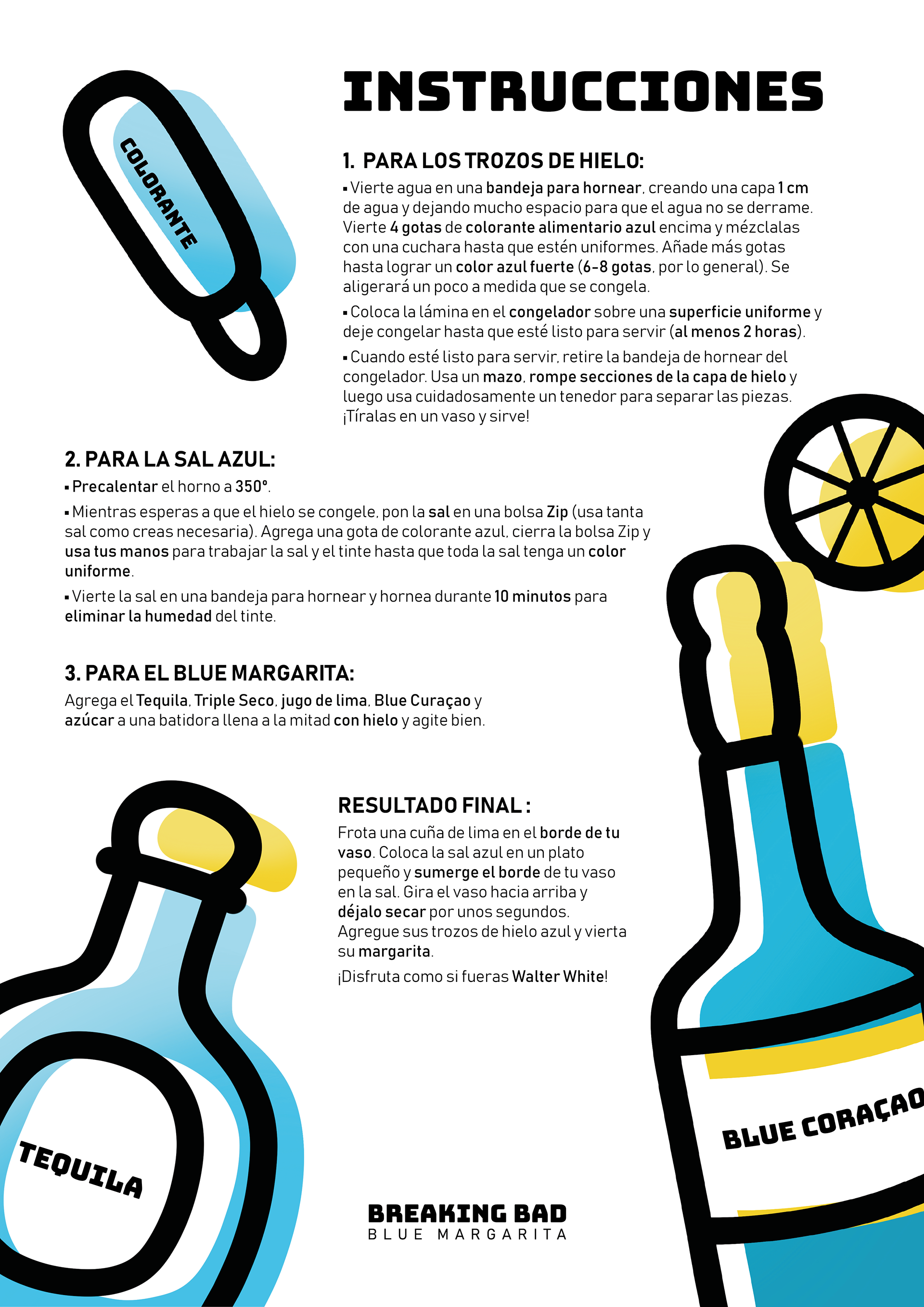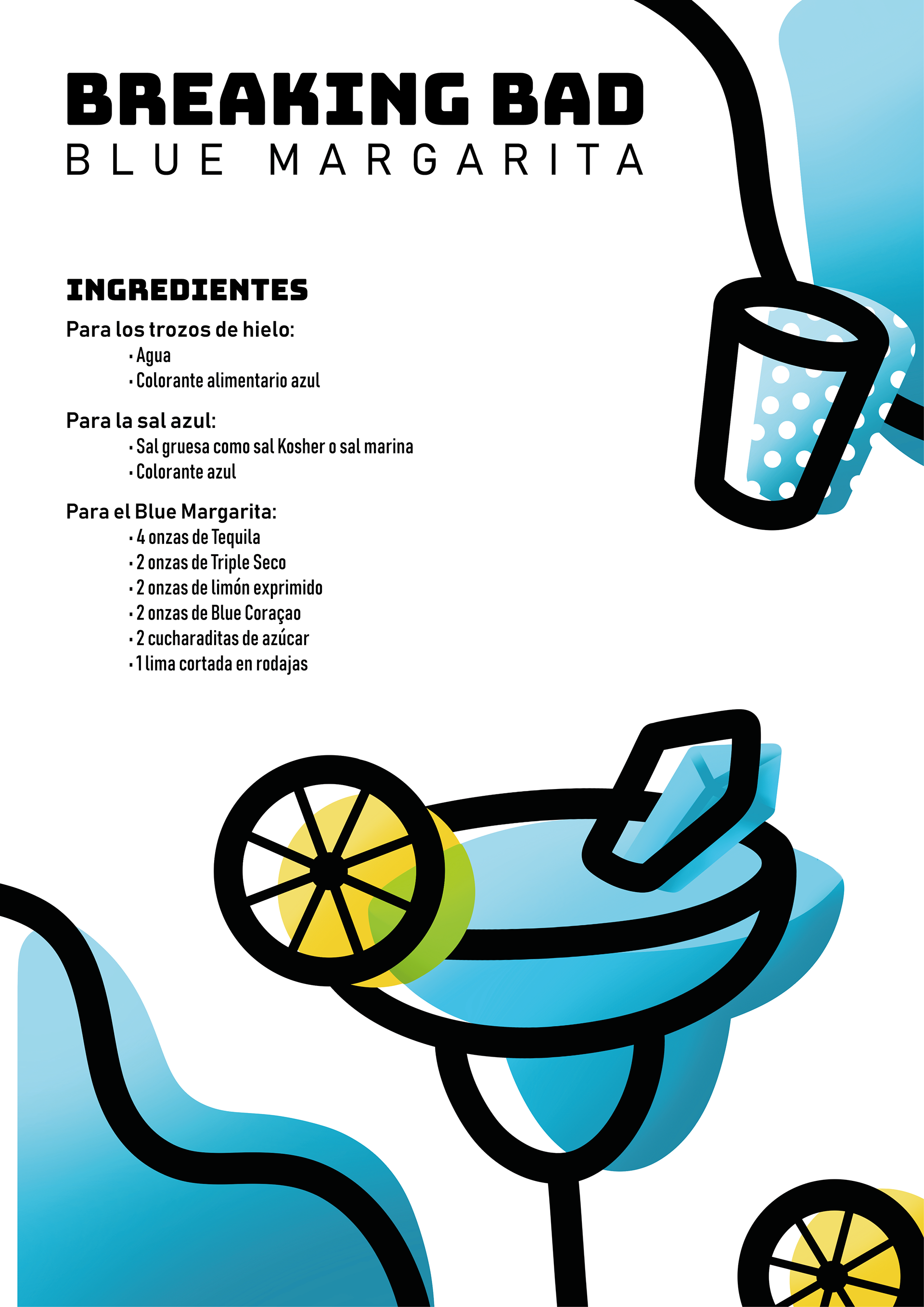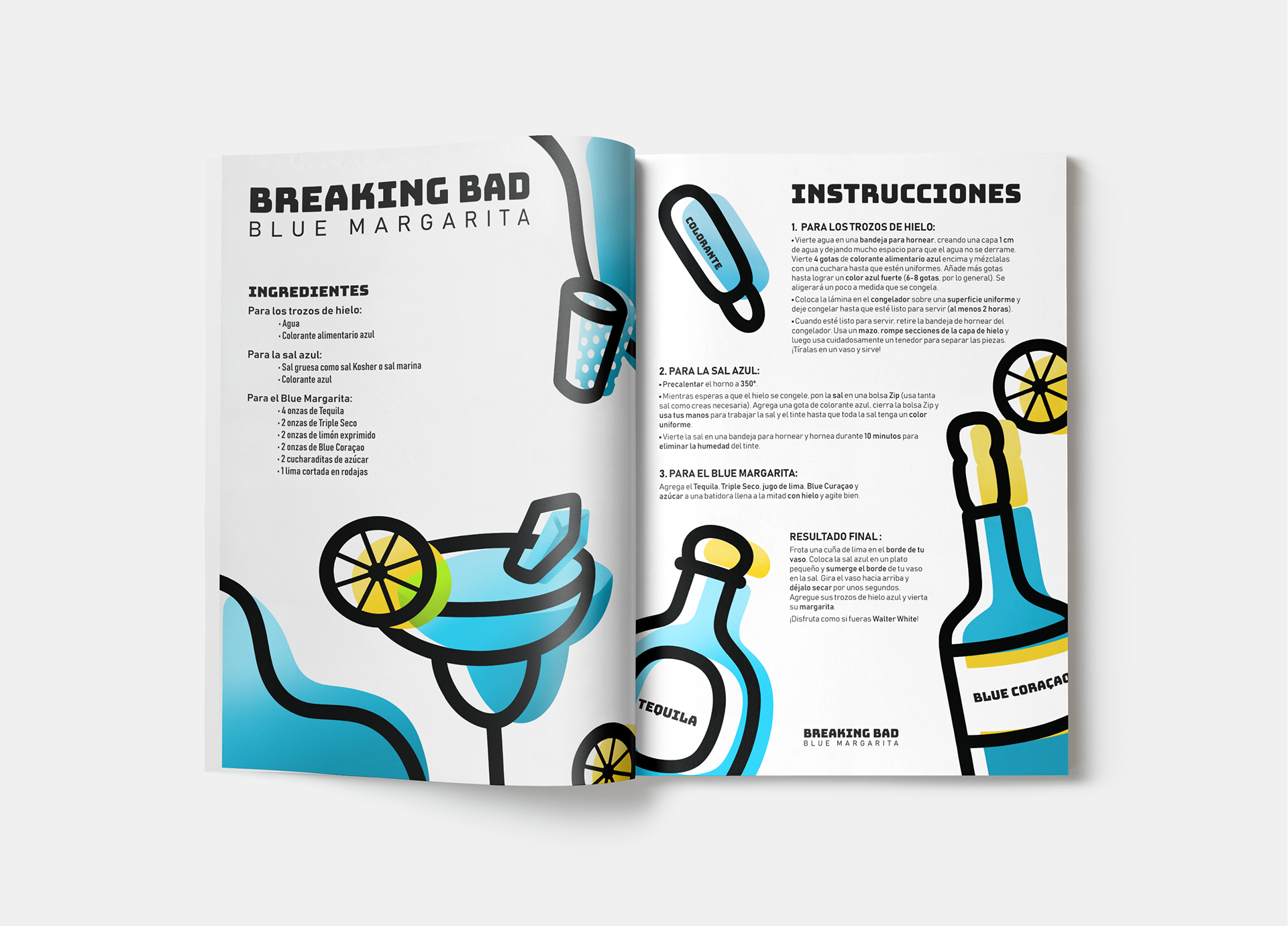 Ilustración didáctica aplicada a una revista sobre una receta de una serie de televisión. En este caso para el Blue Margarita de Breaking Bad, con un estilo minimalista, donde destaca el uso del color y los trazos gruesos.